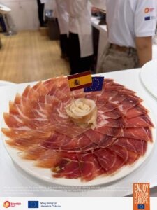 Một điểm nhấn nổi bật tại gian hàng là hoạt động lạng đùi heo muối Serrano trực tiếp từ Tây Ban Nha. Hoạt động này đã thu hút sự quan tâm lớn và mang đến trải nghiệm chân thực về nghệ thuật chế biến giăm bông muối Châu Âu cho khách tham quan trong nước và quốc tế.